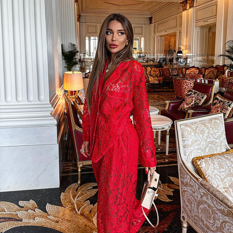 A Lace See-through Sexy Fashion Lapel Shirt Pants Suit free delivery